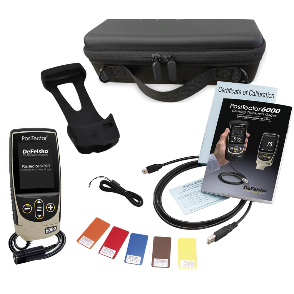 The DeFelsko PosiTector 6000 FJS1 Standard Coating Thickness Gage Kit includes everything needed for testing: - PosiTector Standard Gage Body BDYSTD